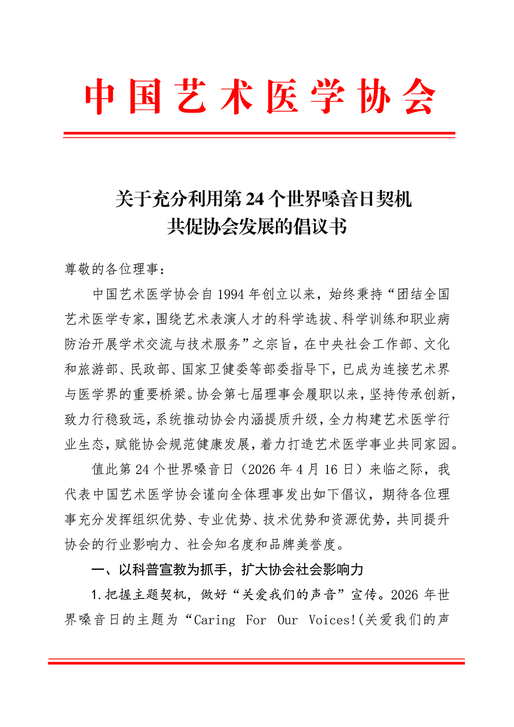 关于充分利用第24个世界嗓音日契机 共促协会发展的倡议书