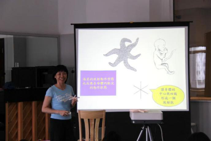 首先,美珠老师为大家介绍了身心学的理念。身心学(Somatics)是一门探究身心关系和体会身体心灵的学问。目前世界各地已发展出许多身心调整、教育与治疗的身心技法和学派,其中身心平衡技法(Body-Mind Centering, 简称BMC)是由美国人Bonnie Bainbridge Cohen(1943-至今)所发展,该派技法的训练课程包括有:身体系统:、发展性动作探索、开发敏锐知觉、呼吸与发声、接触与重新塑型的艺术等五个大方向。目前此技法已被广泛的应用到动作教育、舞蹈教学、运动伤害的预防、瑜珈练习、复健治疗及演员的身体开发等领域中。