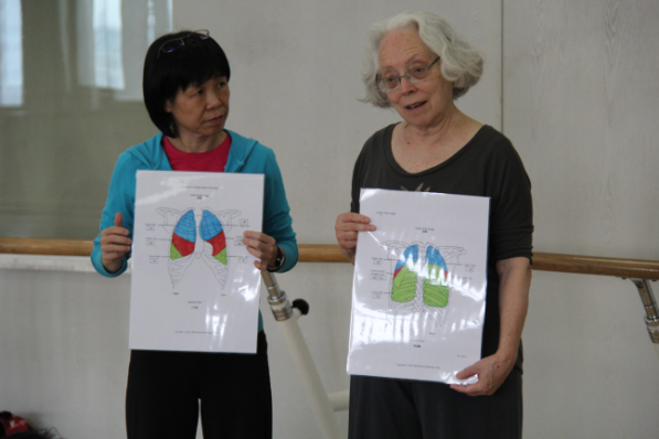 第三天,Bonnie老师与美珠老师带领学员们重点进行了内脏探索与支持以及内脏与动作发生关系的学习。首先主要以内脏系统之中的肺与心脏为例,运用模型与图片让学员们对于内脏系统有一个直观的认识。Bonnie老师从自身多年研究和总结出来的经验解剖学的角度,指出舞者的动作通过意念由体内的心肺带动会更加富有质感,而大部分舞者已经习惯通过肌肉的力量去调动身体。基于这一理念,Bonnie老师教授大家如何感受自己上、中、下叶肺部的呼吸,及集中体验肺部带动身体,肺部包裹心脏进行舞动的全新方式。通过这样的引导,似乎激发了学员们对身体动作潜在的可能性,都不约而同的开始感受身体在动作中的变化。通过身心技法的结构认知与运动体验,学员们纷纷表示在以往舞蹈训练的基础上,由于全新的意念与技法的渗入,更加收获到一种不同的运动感受。